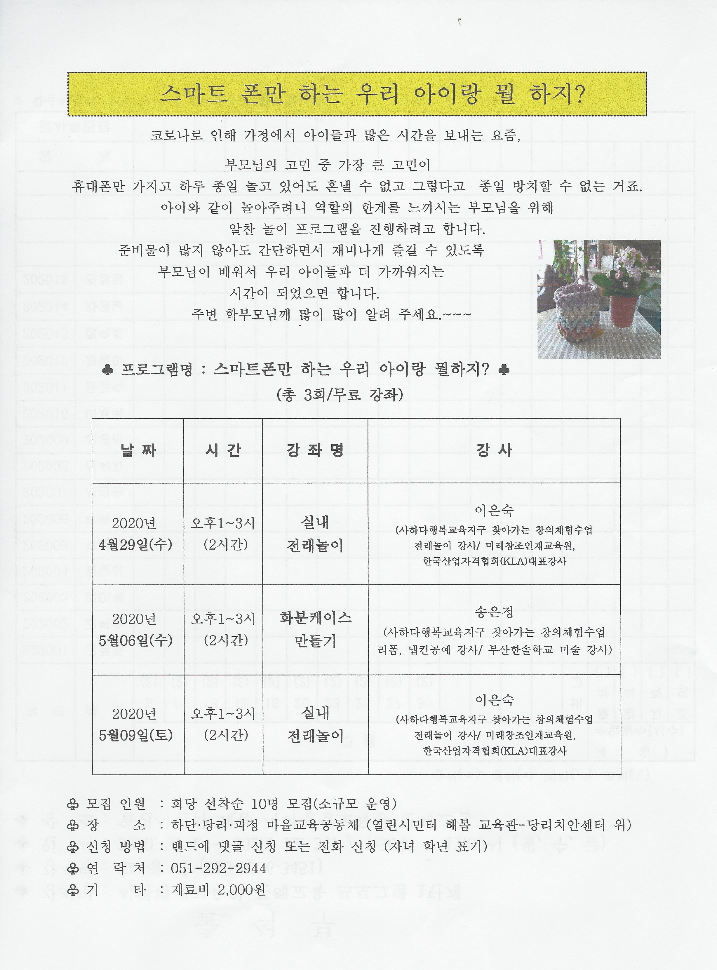 코로나19로 유,초,중,고 우리 아이들 모두가 여러 면에 방치되고 있는 요즘입니다. 아이들과 가정에서 많은 시간을 보내는 부모님들 또한 걱정이 많은 시기인만큼 저희 하단.당리.괴정 마을교육공동체에서 조금이나마 도움이 되고자 무료강좌를 개설하고자 합니다.